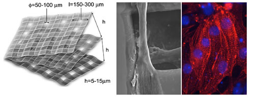 Right: Immuno-fluorescence microscope image showing cell nuclei (blue) and cytoskeletal sarcomeres (red) of fully differentiated CPCs over the 3D scaffold.