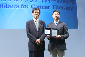 An exhibition of research results obtained by MANA Scientist Dr. Mitsuhiro Ebara, entitled “Development of Anti-Cancer Nanofiber Mesh,” was awarded the Project Prize (Nano-Life Field) at the 13th nano tech International Nanotechnology Exhibition & Conference (nano tech 2014).