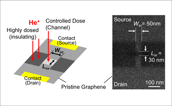 In the technique developed in this research, a helium ion beam is irradiated on graphene using a helium ion microscope to artificially introduce a low concentration of crystal defects, and it becomes possible to modulate the conduction of electrons and holes in the graphene by applying a voltage to the gate electrode. Although this phenomenon of conduction control by introduction of crystal defects had been predicted theoretically, there were no experimental development in which on/off operation at room temperature was achieved experimentally. It would be possible to introduce the technique developed in this work in the existing framework of production technology, including large area wafers.
