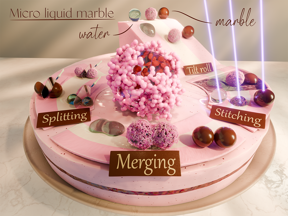 Caption: The pink particle-decorated microdroplet, so-called micro liquid marble, exhibits functionalities of both water and marble. Liquid marble is not sticky like a solid, yet it can split and merge like a liquid, opening a door to a microfluidics wonderland!