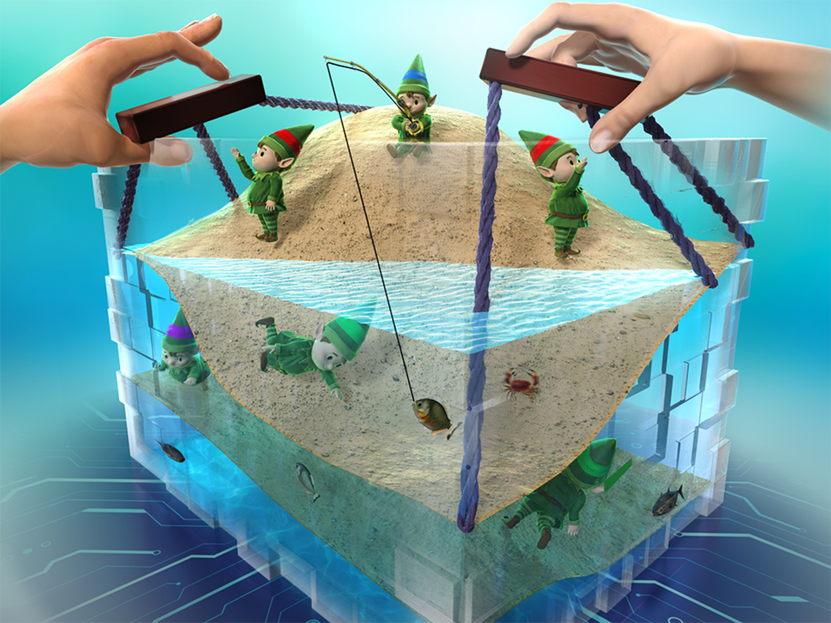 Caption: The electron world, where electrons (dwarfs) explore their energy band (beach), can be manipulated using external fields or light in strongly correlated insulators. This ability enables new electronic devices with advanced functionality.
