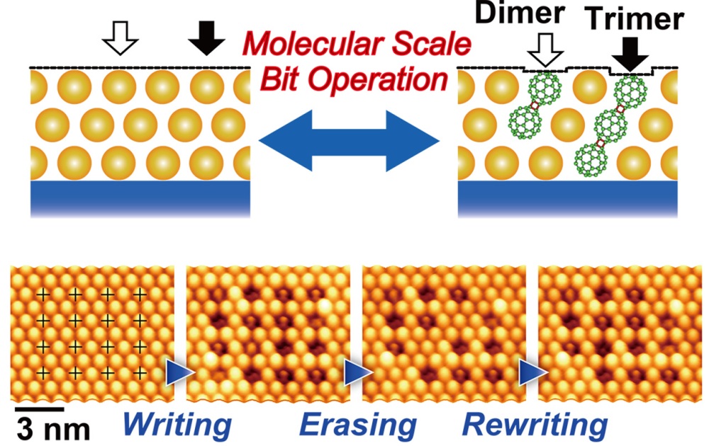 We used a thin film of fullerene C60 molecules and controlled single-molecule-level chemical reaction between C60 molecules in the film using an STM tip. We found that negative and positive ionization of a designated C60 molecule can selectively trigger polymerization and depolymerization reactions of the designated C60 molecule, respectively, with an adjacent molecule in the film. The mechanism of this STM-induced chemical reaction was experimentally and theoretically studied. When the film of C60 molecules is negatively biased against an STM tip, electron donation to C60 molecules occurs under the tip and the lowest unoccupied molecular orbital (LUMO) of C60 , the bound state between C60 molecules, is partially occupied. Further electronic excitation by tunneling electrons fulfills the bound state with two electrons, stabilizing the bound C60 molecule. When using opposite biases, the bound C60 molecules are positively ionized by extraction of electron. The destabilized bound state finally dissolves with the help of electronic excitation by tunneling electrons. Because electronic excitation by STM is in a very confined area, only a single C60 molecule underneath the STM tip can be controlled. Bound and unbound states of C60 molecules are easily recognized by the appearance and disappearance of depression of the film, and we demonstrated ultradense data storage at a bit density of 190 Tbits/in2 by controlling the chemical reactions at a single-molecule precision as shown in Fig. 1.