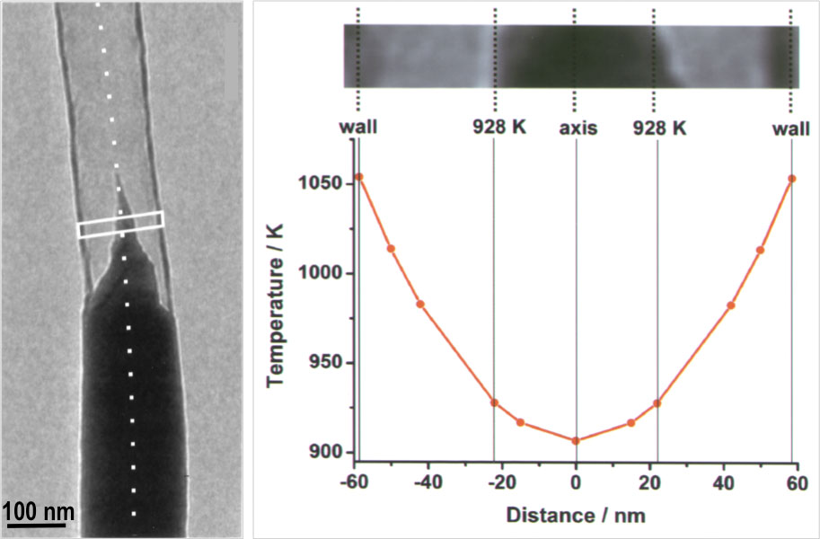 Left panel: Section of a partially empty CNT filled with a sublimable Zn0.92Ga0.08S compound showing a sharp conical needle. The dotted line marks the nanotube main axis. The box encloses the area where the temperature profile was estimated from.