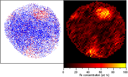 Fig. 5. In the element mapping, individual Fe atoms are shown by red dots, and individual Cr atoms are shown by blue dots. By counting the number of atoms in each pixel, the element map can be converted to a concentration map, where the concentration in each pixel approximately 0.4 x 0.4 nm is shown by a color scale. The observed area corresponds to approximately 20 x 20 nm.