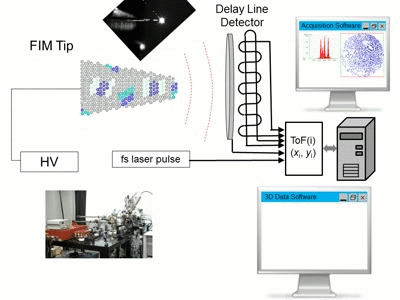 図13にレーザーアトムプローブの原理の模式図を示す。従来装置で用いられていた高電圧パルスの代わりに、針状試料先端にフェムト秒レーザーパスルを照射することで電界蒸発のタイマーと同期させること以外は従来型の3次元アトムプローブ(電圧パルス型)と同じである。唯一の違いは、先に述べたように基本的にレーザーアシストによる 電界蒸発ではイオンのエネルギーが針状試料に加えられたDC電圧になるので、イオンにエネルギー欠損が生じない。 このために直線型であっても質量分解能が著しく改善されることから、試料・検出器間距離を短くすることができる。 結果として検出器の開口角を従来型のアトムプローブの20倍程度でできることが大きなメリットとなっている。