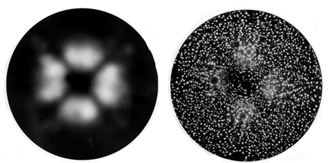 4個の結像ガス原子がイオン化することによって、一つの輝点が形成されると考えられている。その結果これらの半球状の試料先端で突出した原子を蛍光板に投影した位置が明るく観察されることになる。
