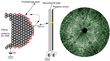 図3に示されるように原子の配列による凸凹が生じており、これに高電圧を加えると原子が突き出た部分に高電界がかかる。そこにNeやHeなどの不活性ガスを導入すると、ガス原子は電界の高い部分でイオン化されてマイクロチャネルプレートに衝突し、その場所に輝点が生じる。つまりマイクロチャネルプレート上には針状試料表面の原子の凹凸を100万倍以上に拡大した像が得られる訳である。