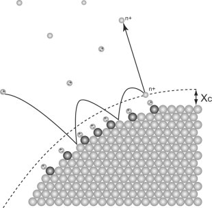 cの距離に達した時に、結像ガス原子は電子をトンネリングにより失いイオン化する。結像ガスの電界イオン化に必要な電界はHeで4.4 × 10