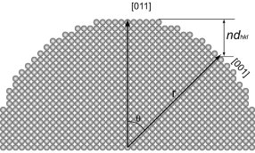 図6では(011)面が6原子層観察される。曲率半径と2つの面の間の角度には次のような関係が成り立つ。