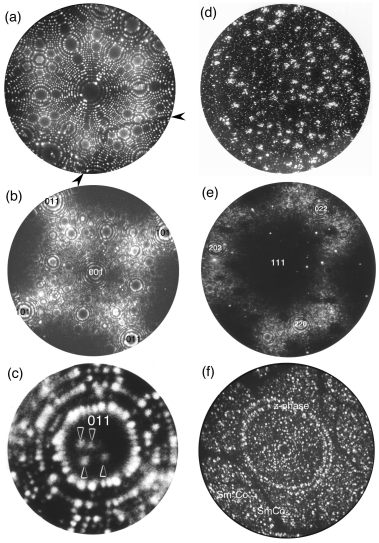 図7. 様々なFIM像。(a)タングステンの結晶粒界、(b)アルミニウムのHeイオン、(c)Geを含むNi3AlのNeイオン像、(d)Feの析出したCr-20at.%Fe合金のNe像、(e)Al3Liの析出したAl-6at.%Li合金、(f)Sm2Co17母相中に析出したSmCo5セル境界相とc軸に平行な板状Z相を含むSm(Co0.72Fe0.20Cu0.055Zr0.025)7.5焼結磁石のNeイオン像。