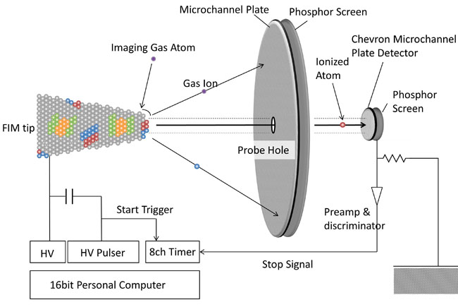 アトムプローブ電界イオン顕微鏡(APFIM)はFIMのスクリーンの中心にイオンが通り抜ける穴をあけて、このイオン飛行時間測定を行うことで、試料表面からイオン化される個々の原子を同定することによりサブナノメーター領域の濃度分析を行う装置である。