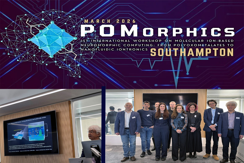 March 3, 2026, group leader Terabe delivered an invited talk at the 1st International Workshop on Molecular Ion-Based Neuromorphic Computing (POMOROHICS), which was held in Southamption, UK. (Talk title:Development of brain-inspired devices via ionic nanosrchitectonics)