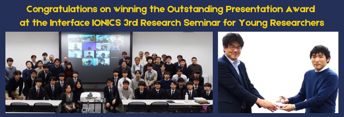D3 student, Mr. Makoto Takayanagi receives outstanding presentation award at the Interface IONICS 3rd Research Seminar for Young Researchers