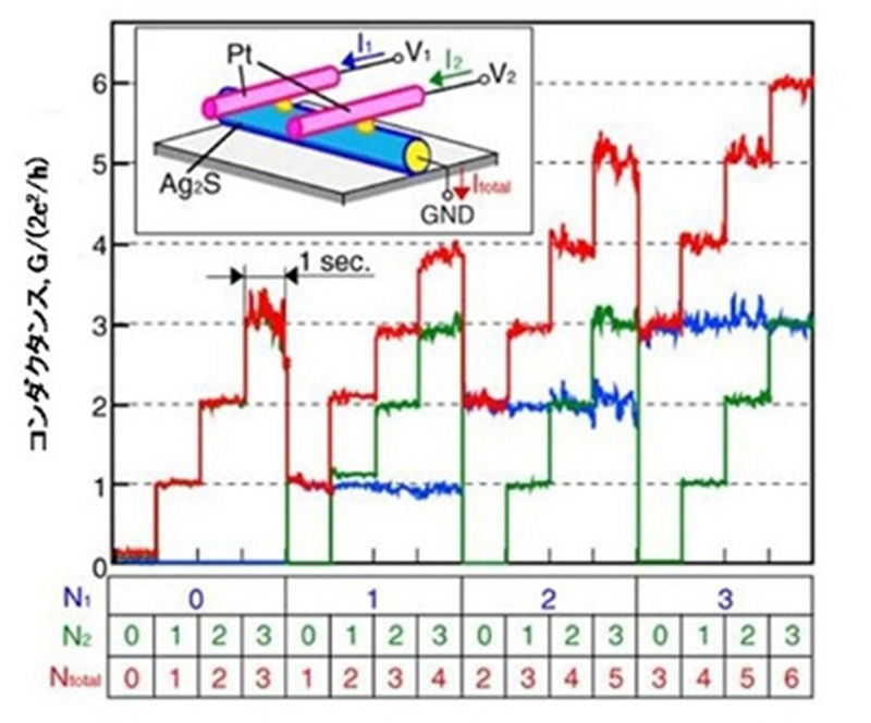 例えば、Ag電極/Ag2S/ギャップ/Pt電極の配列(クロスバー構造)で、2つの交差ポイントに原子スイッチをつくります。各スイッチは、電圧を細かく調整することで量子化伝導を示します。また、その状態に、適切な極性と強さの電圧パルスを与えると、点接触の状態が変わって量子数(量子化された伝導の段階)を自由に切り替えることができます。図5では、とくに量子数0から3までの4つの状態を持つ原子スイッチが2個並んでいて、合計16通りの状態が得られることを説明しています。これによって、多値メモリの開発が可能になります。