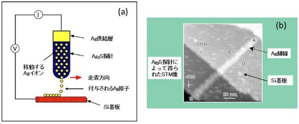 また、「ナノ万年筆」とは、図6(a)のようにAg2S材料のSTM探針(走査型トンネル顕微鏡の先端)を使い、探針と基板の間に適切な電圧をかけることで、探針先端から連続してAg原子を基板上に移動させ、細い金属線を描くことができる技術です。つまりSTM探針自体が「ナノ万年筆」となり、インクはAg2Sの中を動くAgイオンです。こうした極細のナノペンを使えば、試料の表面に自由な形の金属原子細線を描くことができます(図6(b)参照)。