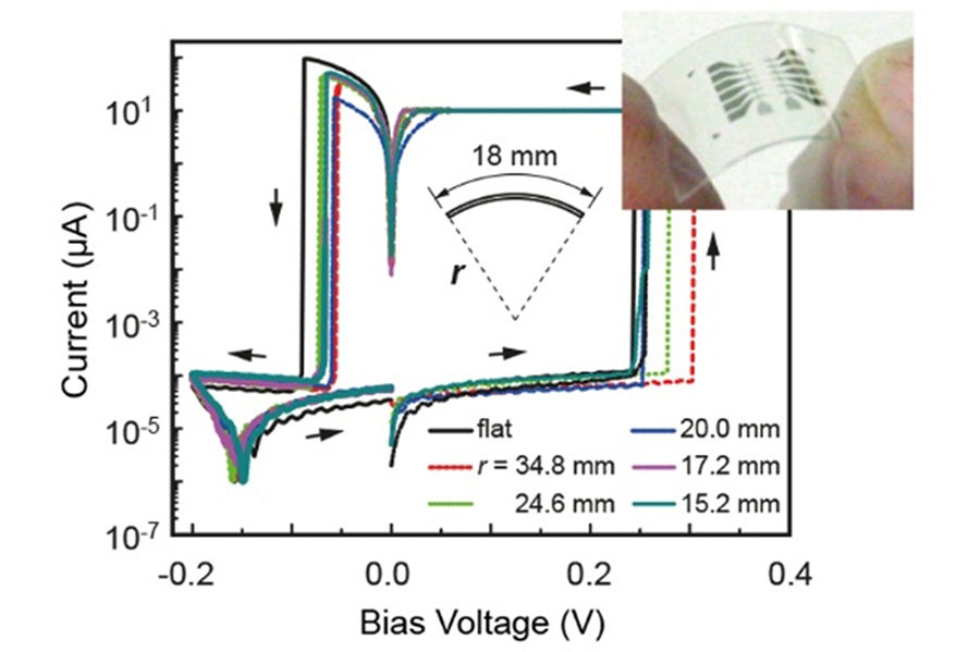 さらに、高分子の柔軟な性質を生かして、プラスチック基板にインクジェット印刷でSPE膜を塗布し、原子スイッチ素子を作製しました。その結果、基板を曲げても安定して動作することが確認できました(図10)。この成果は、原子スイッチをフレキシブルエレクトロニクス分野に応用できる可能性を示しています。