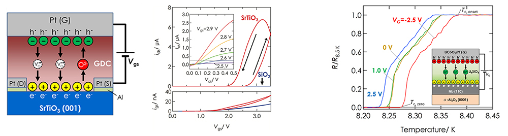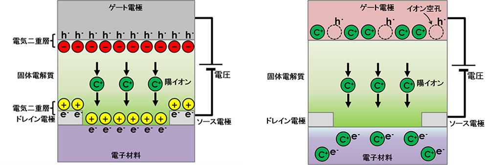 図13(右)に示した全固体酸化還元トランジスタにゲート電圧が印加されると、電気二重層トランジスタと同じく固体電解質内でイオン輸送が起こりますが、イオンは電子材料内に挿入されます。挿入されたイオンによって持ち込まれた電荷を補償する形で電子キャリアが電子材料中に注入されます。このような電子キャリアの制御法を酸化還元反応と呼びます。この場合もゲート電圧によって電子キャリア濃度を可逆的に制御することが出来ますが、反応機構に比較的進行が遅い素過程が含まれる場合、不揮発的な動作が得られるという特徴があります。これは情報通信デバイスへの応用上、大変有利な性質と言えます。