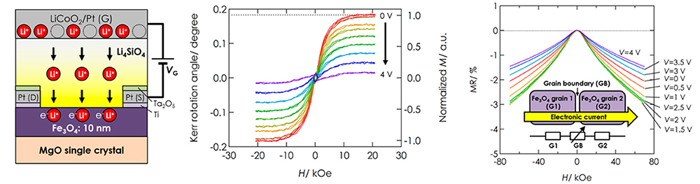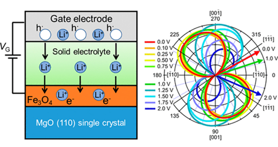 近年、様々な磁気効果(磁気抵抗効果、巨大磁気抵抗効果、トンネル磁気抵抗効果、磁気光学効果等)が情報通信デバイス、特に高容量メモリ素子に応用されています。磁気特性の新しい制御法が開発されれば、従来技術で得られない特性・性能を有する新規なメモリ素子の創出に繋がる可能性があります。そこで、図15(左)に示すようなリチウムイオン伝導体と高密度の電子キャリアを有する室温強磁性体Fe3O4を組み合わせた全固体酸化還元トランジスタを作製し、磁気特性の制御を試みました。電圧印加により1021cm-3もの高密度のリチウムイオンがFe3O4薄膜中に挿入されることで同密度の電子キャリアが電荷保証として注入され、Fe3O4のスピン数が変調され、可逆的に自発磁化や磁気抵抗効果が制御されています(図15(中)(右))。さらに、Fe3O4薄膜の結晶成長方位を制御することで、図16に示すように、磁化の向きも変化していることを突き止め、室温で56°もの磁化回転を達成しました。この結果は、磁場を必要としない低消費電力なスイッチング可能なメモリ素子としてだけでなく、イオンと磁化の複雑なダイナミクスを利用したニューロモルフィックデバイスへの応用が期待されます。