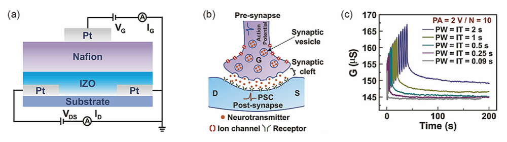 シナプス的動作をする全固体酸化還元トランジスタのために、InとZnからなる酸化物(IZO)をチャネルとしプロトン伝導体Nafionと組み合わせ、全固体酸化還元シナプストランジスタを作製し、動作実証を行いました(図17(左)(中))。パルス状のゲート電圧を印加することでIZOチャネルとNafionの間のプロトンの挿入・脱離(酸化・還元)を利用してチャネルコンダクタンスを制御できます。パルス電圧を印加することでチャネルコンダクタンスは増加します。パルス幅と間隔を短くすることでコンダクタンスが初期状態に戻る短期記憶、パルス幅と間隔を長くすること増加したコンダクタンス状態が一定時間保持される長期記憶状態を実現できました(図17(右))。短記憶状態はIZOチャネル中へのプロトン拡散が寄与し、長期記憶状態はNafion中のプロトン拡散が寄与しています。