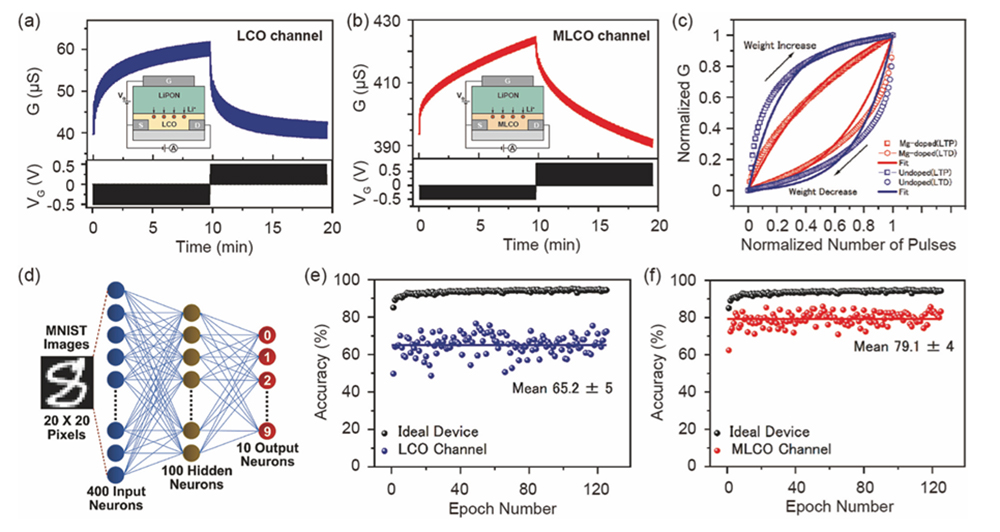 リチウム固体電解質を利用したトランジスタもアナログコンピューティングのためのハードウェアニューラルネットワーク実現のために有望な材料であり、さまざまなリチウム電解質とチャネル材料で研究されています。特にLiCoO2はリチウムイオン電池の電極としても有望な材料で、シナプストランジスタのチャネルとして使われています。私たちは、LiCoO2のCo3+サイトにMg2+を部分的に置換することで、パルス入力に対する電気伝導度応答はLiCoO2の時に見られた非線形性を大幅に抑制することに成功しました(図18(a)-(c))。これを利用して、入力層・隠れ層・出力層からなる全結合型ニューラルネットワークの手描き文字認識の正答率を評価しました(図18(d))。LiCoO2チャネルのトランジスタの正答率65%に対して、Mg2+を置換したLiCoO2チャネルのトランジスタの正答率は79%であり、大幅な計算性能向上に成功しただけでなく、エポックごとのばらつきも小さくなり信頼性も向上しました(図18(e),(f))。全固体酸化還元シナプストランジスタにおける元素置換はニューロモルフィックシステムの性能向上に非常に有効であることを実証しました。
