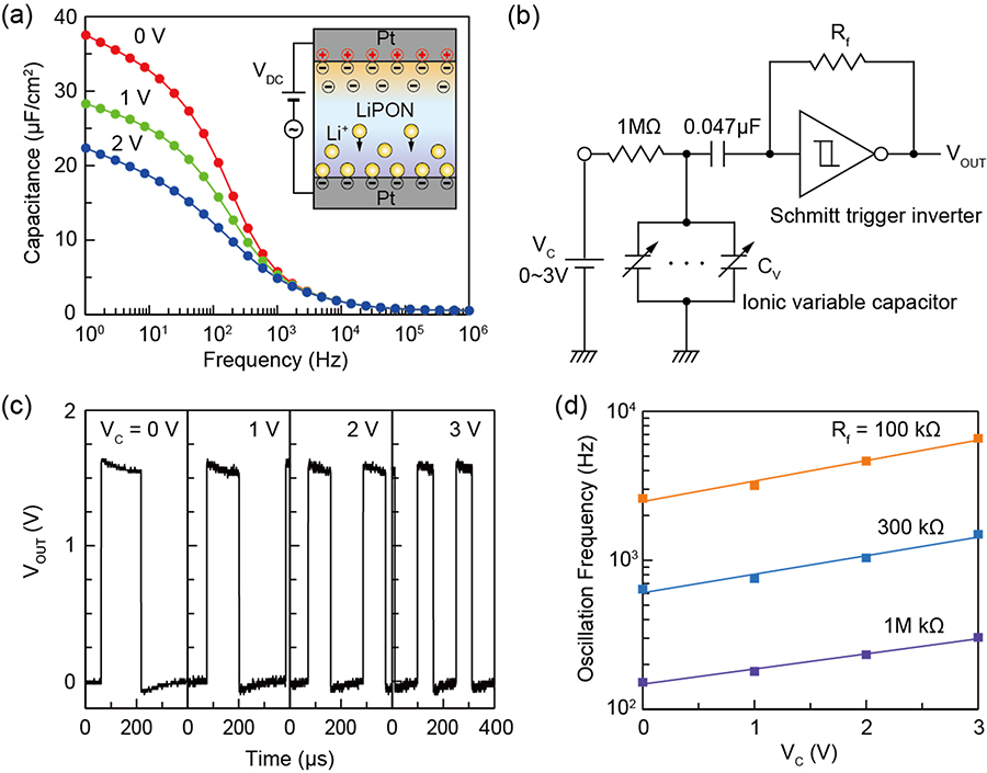Pt/リン酸窒化リチウム(LiPON)/Pt構造におけて、Liイオンの輸送を利用した可変容量機能を実証した(図19)。この容量は主に、低周波数領域においてはLiPONとPtの界面で形成される電気化学的二重層(EDL)に起因する。電圧印加により、正にバイアスされた電極から負にバイアスされた電極へリチウムイオンが移動する。高電圧域では、正極におけるリチウムイオン数がゼロに減少するため、総電気二重層容量への寄与が消失する。その結果、LiPONコンデンサは電圧バイアスが増加するにつれて容量が減少する挙動を示し、バラクタダイオードで見られる特性と類似している。容量変動の上限周波数は温度上昇に伴い増加し、これはLiPON中のイオン伝導度によって決定されると考えられる。また、LiPONコンデンサをRC発振回路に組み込むことで、電圧制御発振器(VCO)動作も実証された。このVCOは、入力直流電圧の増加に伴い出力波形の振動周波数が指数関数的に上昇することを明確に示しており、この挙動はバラクタダイオードベースのVCOと同様である。これらの結果は、このイオンコンデンサがアナログおよび混合信号電子回路の構成要素として使用可能であることを示唆している。