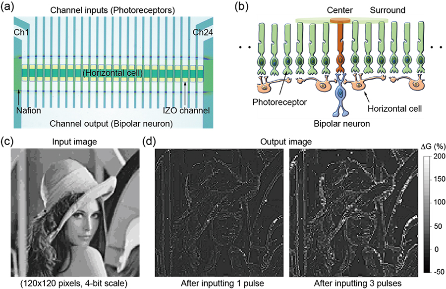 側方抑制は網膜ニューロンで観察される現象であり、エッジ知覚を強化し視覚画像のコントラストを高める。ハードウェアによる側方抑制の実証として、我々のグループはリチウムイオン移動駆動型マルチチャネル素子を提案した(図20)。この素子では、一次元(1D)リチウムコバルト酸化物(LCO)チャネルがリチウムリン酸窒化物(LiPON)電解質上に配列されている。電圧パルス印加下でLiイオンが共通のLiPON電解質を介してLCOチャネル間を移動するため、隣接チャネル間で興奮/抑制挙動が観察された。この特性を利用し、2次元チャネル配列構造を想定することで視覚画像のエッジ検出をシミュレートした。さらに、横方向抑制の原理を応用し実画像のエッジ検出を目的とした新規プロトン移動駆動型マルチチャネル素子を開発した。本素子は24個のインジウム亜鉛酸化物(IZO)チャネルで構成され、共通のナフィオン電解質内でのプロトン移動を介して相互接続されることでIZOチャネル間の高い相互作用性を実現している。各チャネルの導電度は、電圧パルス印加によるプロトンの挿入・脱挿入の結果として生じるチャネル内のプロトン濃度によって決定される。本素子は、中心-周辺拮抗やマッハバンド・ハーマン格子などの錯視現象など、網膜の様々な機能を明確に模倣しており、特に明暗境界領域における知覚コントラストの増強が確認された。これらの特性に基づき、我々は多チャンネル素子を用いて、イオン性材料の固有特性を活用し実画像からエッジ情報を抽出することに成功した。これらの結果は、プロトンベースの高相互作用デバイスが、ハードウェア指向型人工視覚システムの開発に関連する応用分野での利用可能性を有することを示唆している。