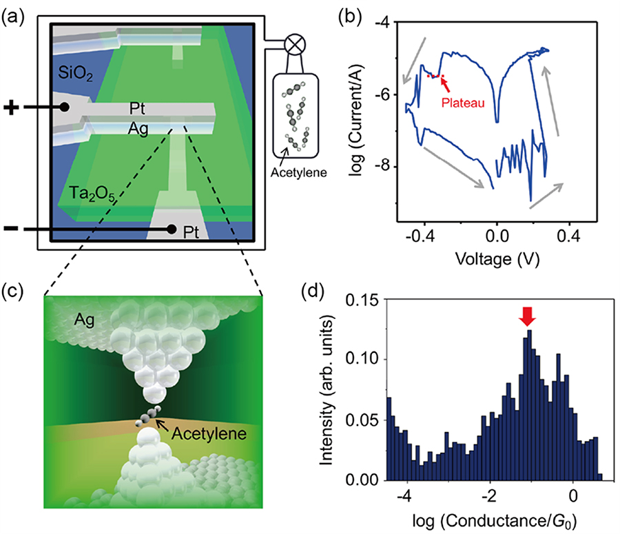 分子エレクトロニクスは、ポストシリコンエレクトロニクスへの応用可能性から注目を集めている。しかし、分子電子素子の基本構成要素である分子接合の作製には複雑な手順が必要であり、新規デバイスの効率的な開発を妨げている。我々は東京科学大学との共同研究において、酸化還元反応と金属原子の移動によって作動する原子スイッチを利用することで、簡便な作製プロセスを提案した(図21)。Ag/Ta2O5/Pt原子スイッチを真空チャンバー内に配置し、キャピラリーを通じてアセチレン分子を導入する。アセチレン雰囲気下で測定した典型的な電流-電圧(I-V)特性は、リセット後に電流プラトーを示す。原子レベルで薄い金属線の断線時の定電流特性は、機械的破断による分子接合で一般的に観測され、準安定構造の形成を示唆する。この準安定構造として最も可能性が高いのは、銀フィラメントの隙間にアセチレン分子が収容されることである。I-V曲線から構築したコンダクタンスヒストグラムは、10-1 G0付近に単一原子接点よりも低いコンダクタンスを示す広帯域状態を示す。非弾性電子トンネル分光測定と第一原理計算から、観測された伝導状態は銀フィラメント間に形成されたアセチレン分子接合に起因することが明らかとなった。本手法は原子スイッチ技術に基づく単一分子素子の開発への道を開き、異なる分子接合や原子スイッチの統合を可能とする。