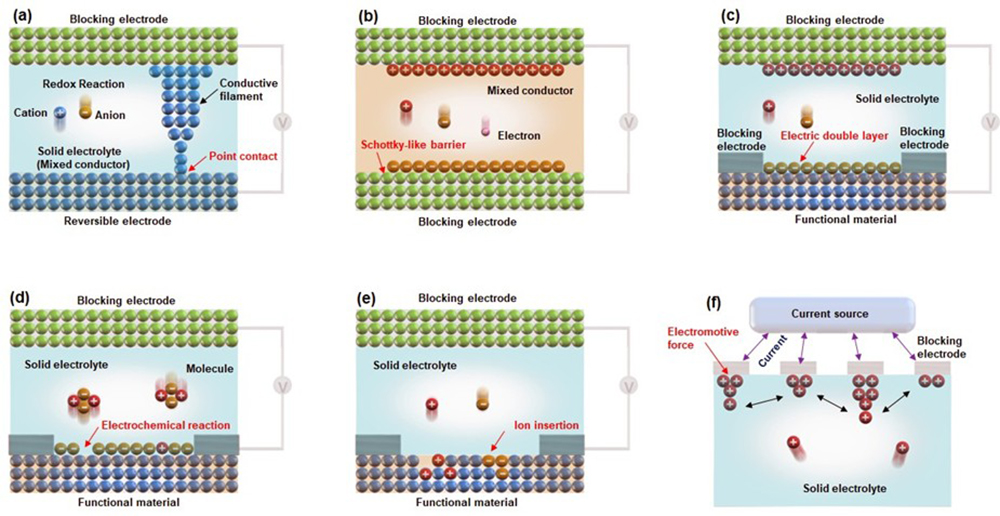 1.図1(a)の素子は、電極間にイオン伝導体または混合伝導体を挟んだ構造で、電圧をかけて導電性フィラメントを形成・消失させることで、抵抗変化を実現します。これにより、量子化コンダクタンス原子スイッチ、不揮発性メモリ、人工シナプス、耐放射線スイッチが開発されています。
