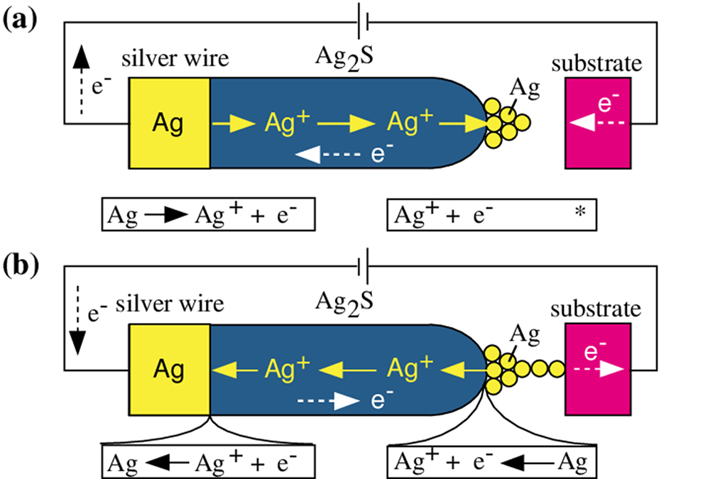 逆に、電圧の向きをプラスにすると、今度は探針の先端の銀突起から基板へ電子が流れるようになります。このとき銀突起の中の銀原子は酸化されてイオン(Ag⁺)になり、Ag₂Sの中に戻ります。その結果、突起は小さくなり、消えてしまいます(図2(b))。