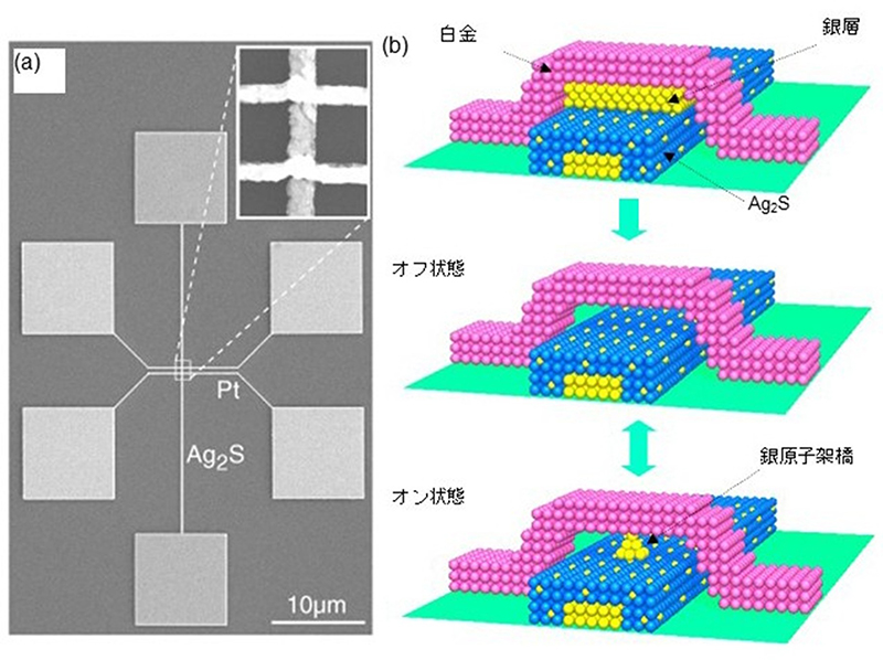 実際に作製した原子スイッチの電子顕微鏡写真と構造の図が図3(a)(b)に示されています。その構造は、Ag(銀)細線、Ag₂S(硫化銀)細線、約1nmほどのとても薄いAg薄膜、そしてPt(白金)細線(電極)を重ね合わせたクロスバー構造になっています。
