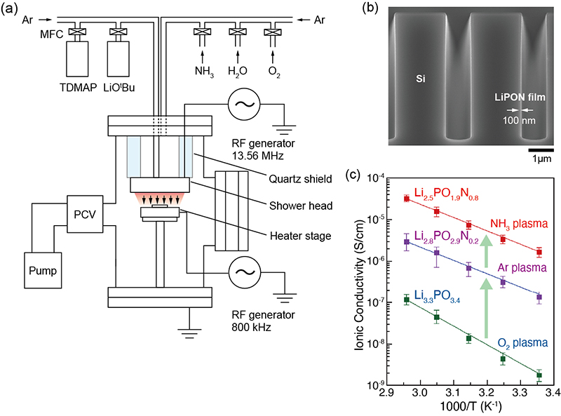 イオン伝導体薄膜は、イオン電池や燃料電池の重要な構成要素であるだけでなく、ナノイオニクスおよび情報技術素子の必須部品でもある。固体電解質薄膜の製造には高周波スパッタリングやパルスレーザー堆積法が用いられる。しかし、これらの技術では三次元(3D)マイクロ電池や集積回路上に均一な薄膜を形成することが困難である。近年、ALD法が、原子レベルの精度で複雑な構造体上にピンホールのない均一な固体電解質薄膜を形成可能な技術として注目されている。我々は、マイクロ電池およびニューロモーフィックデバイスにおける固体電解質(SSE)としての潜在的な利用を視野に、高品質なリン酸窒化リチウム(LiPON)薄膜の作製に関連して、リン酸リチウムのプラズマ補助ALD法におけるプラズマ反応剤の影響を調べた(図22)。本ALDプロセスでは、リチウム前駆体としてリチウムtert-ブトキシド(LuOtBu)、リン前駆体としてトリス(ジメチルアミノ)ホスフィン(TDMAP)を用い、220-300℃の成膜温度範囲でリン酸リチウム母体への窒素導入を実現した。O2プラズマでは、比較的整列したピロリン酸構造を有する多結晶リン酸リチウム膜が成膜される。一方、アルゴンまたはNH3プラズマを使用すると、ピロリン酸塩とオルトリン酸塩が混合したアモルファスLiPON膜が得られる。NH3流量が増加すると窒素組成は約13%まで上昇するが、残留炭素は数%以下に抑えられる。NH3プラズマを用いて300℃で成膜したLi2.5PO1.9N0.8薄膜のイオン伝導度は、25℃で1.65±0.42×10-6 S/cm、活性化エネルギー0.66 eVと測定された。この伝導度は、これまでに報告されているALD法によるLiPON薄膜の中で最高値である。我々のALDプロセスは、リン酸窒化物マトリックスの分子構造を高度に制御可能であり、高いイオン伝導性を示すため、高性能Li SSE薄膜の実現に適している。