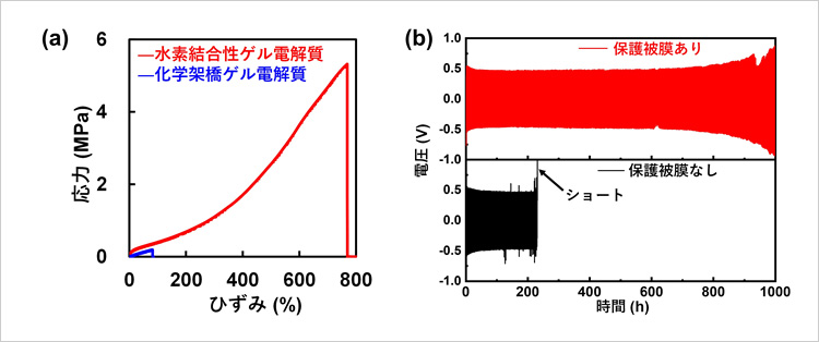 (a)開発した水素結合性ゲル電解質と従来の化学架橋ゲル電解質の引張試験。