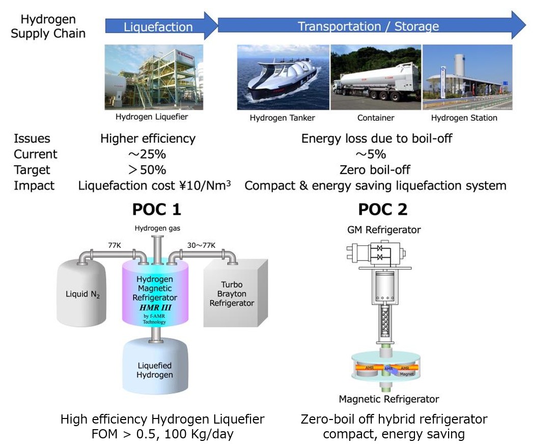 For the supply chain of hydrogen, liquefaction cost may occupy1/3 of total supply price, therefore, developing a high-efficient hydrogen liquefier is one of the most important technology issues for incoming hydrogen society. Magnetic refrigeration using the magnetocaloric effect has potential to realize liquefaction efficiency higher than 50%, and also to be environmentally friendly and cost effective. A hybrid refrigeration cycle consisting of precooling cycle and magnetic active regenerator cycle has been proposed and estimated to achieve a liquefaction capacity of 100kg/day with FOM=0.5. Our new project is committed to develop① such a high efficient hydrogen liquefier and also, ② compact and energy saving re-condensation refrigerator to realize zero boil-off in the liquid hydrogen storage.