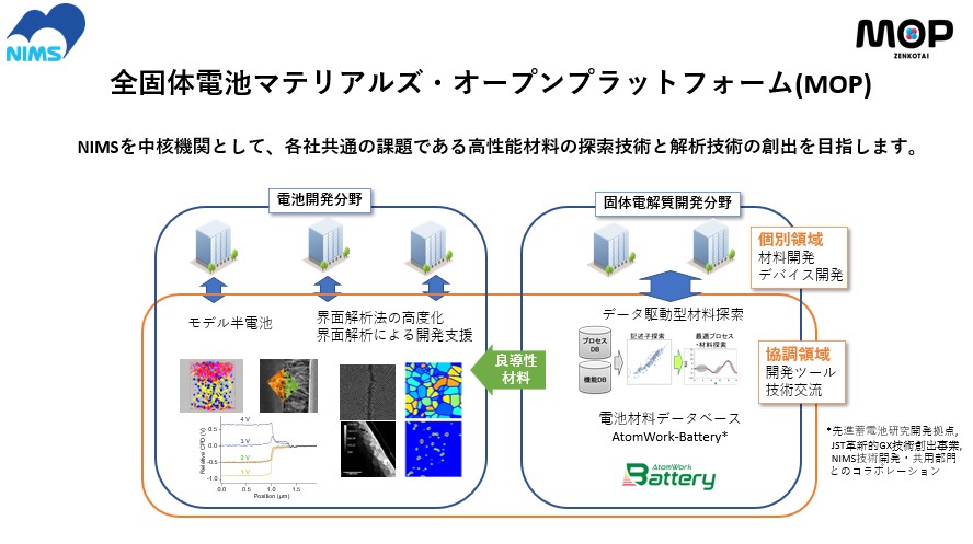NIMSは酸化物型全固体電池の開発に関心の高い企業とともに、酸化物材料を電解質とした酸化物型全固体電池を将来の蓄電池と位置づけ、激化する世界の開発競争にオールジャパン体制で打ち勝つために全固体電池マテリアルズ・オープンプラットフォーム(Materials Open Platform、以下MOP)を、2020年5月1日に設立しました。