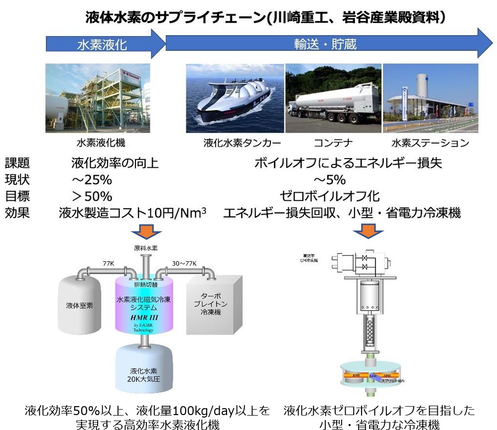 液体水素は気体水素の1/800の体積で、大量輸送、大量供給、大量貯蔵、省スペース等の特長があり、水素エネルギーの本格的な普及には欠かすことができません。しかし、液化点が20K(-253℃)の極低温のため、液化には相応のエネルギー投入が必要であることや、ボイルオフの発生が避けられないことにより、液体水素利用コスト上昇の原因となっています。低コスト化を実現するためには、気体冷凍法では到達困難な液化効率50%以上を達成することが必須です。