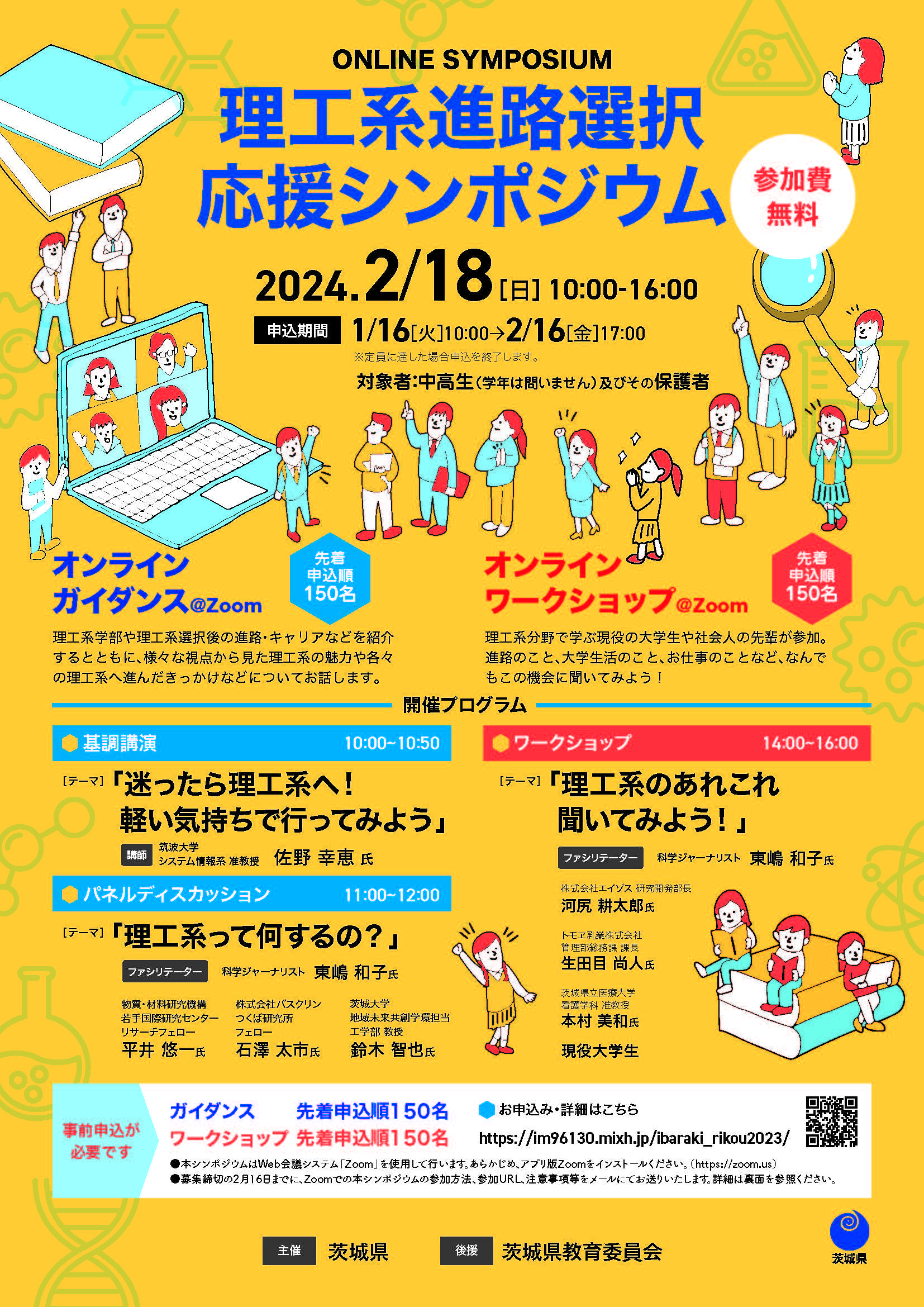 茨城県では、科学技術を担う人材育成を目指し、文理選択や将来の進路に迷う中高生を対象として、理工系分野への興味関心と理解を深め 、当分野への進路選択促進に取り組んでおります。