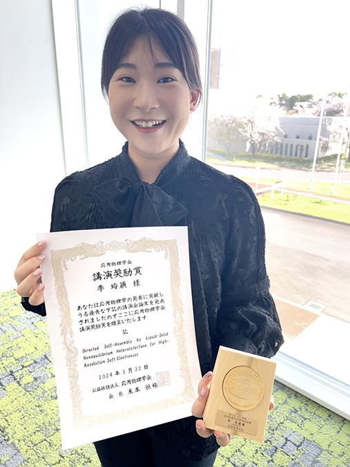 第55回(2023秋季)応用物理学会学術講演会において、ICYSリサーチフェローのDr.Lingying LI氏が講演奨励賞を受賞し、2024年3月22日に表彰されました。講演奨励賞は、応用物理学会春秋講演会において、応用物理学の発展に貢献しうる優れた口頭発表を行った若手JSAP会員の功績に対し贈られる賞です。