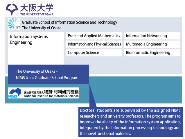 The NIMS Joint Graduate School Program with The University of Osaka has been formed to guide graduate students towards a doctoral degree. In October 2021, the collaborative program "Materials Informatics Laboratory" was established in the Department of Information Systems Engineering in Graduate School of Information Science and Technology at The University of Osaka.