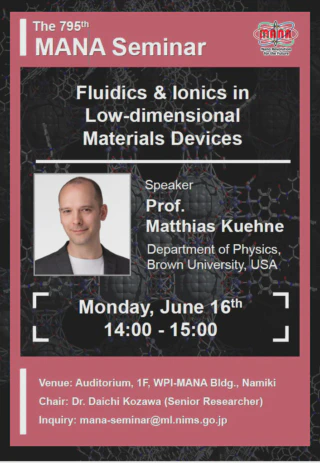 Prof. Kuehneには第795回MANAセミナーで「Fluidics & Ionics in Low-dimensional Materials Devices」と題してご講演いただきました。ご講演では、2D材料へのインターカレーションやカーボンナノチューブのような1桁ナノメートルスケールの細孔内での水の振る舞いなど、ナノスケールでの流体とイオンの挙動の理解に関する最新の進歩についてお話しいただきました。