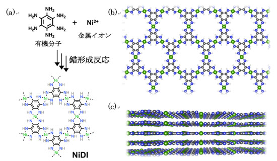 プレスリリース中の図 : (a) 有機分子と金属イオンが反応しNiDIを生成する、合成のスキーム。(b, c) 上面および側面から見たNiDIの構造 (緑 : ニッケル、黒 : 炭素、青 : 窒素、白 : 水素) 。NiDIは原子層薄膜が積層した層状構造を取り、シートの面内は六角形が配列したハニカム構造を形成している。