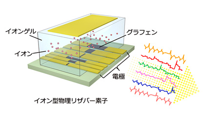 プレスリリースの図: 水の電気分解の様子。中央の曲がった構造の材料が今回対象とした電極。