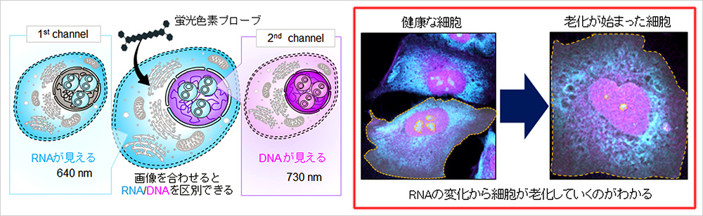 細胞内でDNAとRNAを同時に見分ける(左)と細胞が老化していくのがわかる(右)