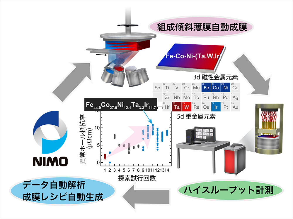 研究チームは、組成傾斜薄膜に適したAI最適化手法(ベイズ最適化:データから次に試す条件を賢く選ぶ方法)を開発し、NIMS主導の自動自律実験用オープンソースソフトウェア「NIMO」に実装しました。これにより、実験と解析-予測を自動で繰り返すクローズドループを構築し、多数の試料を一度に評価しながら効率的に材料探索を進めることが可能になりました。実証として、Fe–Co–Ni–(Ta,W,Ir)(鉄-コバルト-ニッケル-(タンタル、タングステン、イリジウム))系の5元系薄膜を対象に異常ホール効果の最大化を目指した探索を行い、室温成膜の磁性薄膜として報告例の中で最大級に匹敵する異常ホール抵抗率(10.9 μΩ·㎝)を実現する新規アモルファス薄膜Fe44.9Co27.9Ni12.1Ta3.3Ir11.7を見出しました。