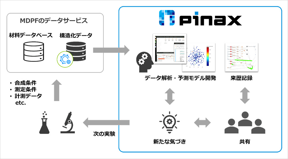 pinaxは、データ解析の試行錯誤を知見に変えて共有・継承し、次の研究へとつなげる好循環を生み出すことで、マテリアルDXを加速させます。