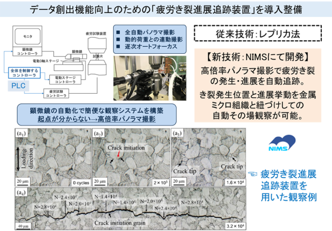 2021年と2022年における研究環境整備では、き裂進展の3次元観察を可能とするラボ用のX線CT装置に加えて、疲労き裂進展追跡装置 (下図) をNIMS内に導入し、研究開発に活用しています。