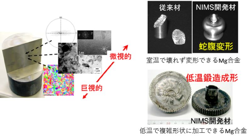 マグネシウム合金は、結晶構造 (=六方晶構造) に起因して、塑性変形時に双晶を形成することで知られています。しかし、双晶と母相の界面は、き裂の進展経路になりやく、マグネシウムの脆さの要因です。ここでは、原子・ナノレベルでは母相に分散する粒子の界面や形態の制御、ミクロレベルでは結晶粒界や結晶粒サイズの制御、マイクロレベルでは底面の配向を、各々階層的に制御することで、強度特性を損なわず、靱性の改善に成功しています。