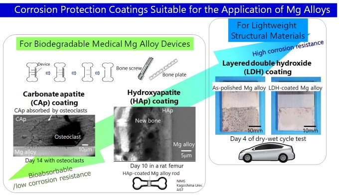 Layered double hydroxide (LDH), a corrosion product formed on Mg alloys in coastal areas, is used for the corrosion protection coating of Mg alloys for lightweight materials. For Mg alloys for medical applications, we are developing hydroxyapatite (HAp) coatings that are stable in vivo and carbonate apatite (CAp) coatings that are absorbed by osteoclasts.