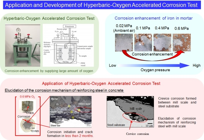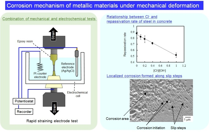 Extending the service life of structures will help shift from a "scrap-and-build" flow-oriented society to a stock-oriented society and achievement to a recycling-oriented and low-carbon society. Deterioration of concrete structures is caused by a corrosion of steel rebars, so that development of corrosion-resistant rebars and surface modification are being carried out. We are elucidating the effects of various corrosion factors on the corrosion mechanism of steel rebars using an original accelerated corrosion test method developed for rebars in concrete.
