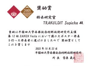 2025年10月23日、早稲田大学 各務記念材料技術研究所 2025年度 第12回 ZAIKEN Festa(ポスターセッション)にて、NIMS構造材料研究センター耐食材料グループの新宮 やよいさん、Supicha Trakulditさんの2名が奨励賞を受賞しました。