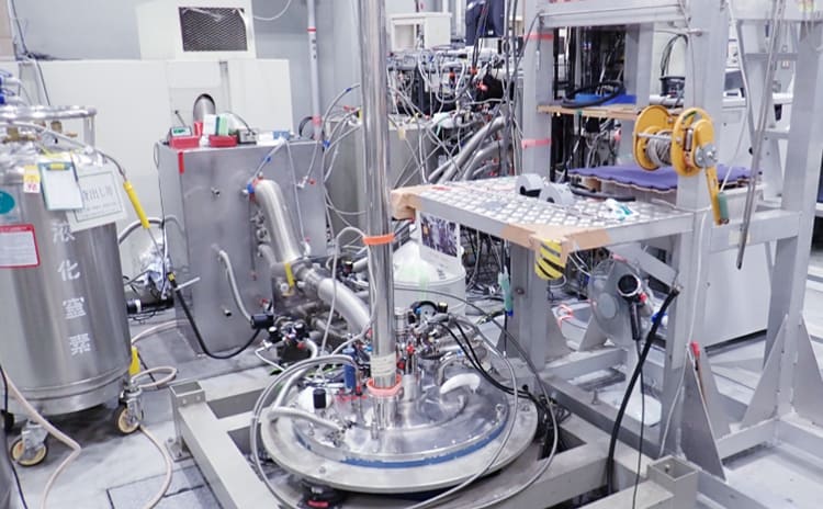 超高圧下での物質合成研究では、単結晶などを長時間安定して育成できる大容量の高圧装置が必要です。このベルト型高圧装置は、2次元原子デバイスに不可欠な六方晶窒化ホウ素単結晶を量産し、世界35カ国、350以上の研究グループに提供しています。